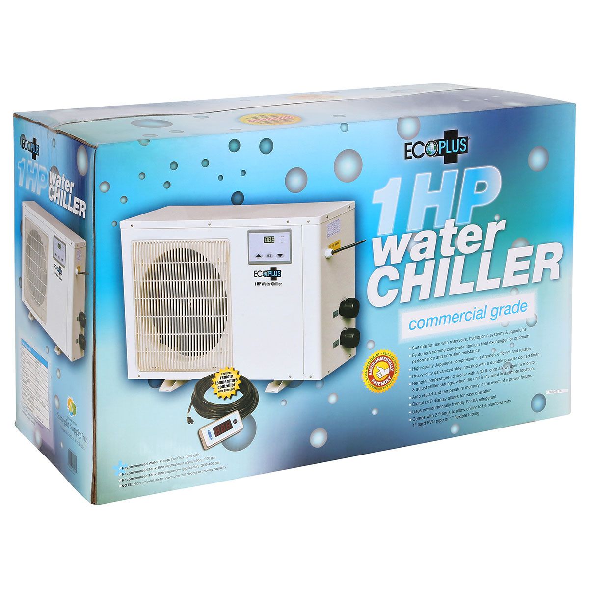 Le compresseur japonais de haute qualité est extrêmement efficace et fiable. Boîtier robuste en acier galvanisé avec un revêtement en poudre durable. L'affichage numérique à cristaux liquides permet une utilisation facile. Le contrôleur de température à distance avec un cordon de 30 pieds permet à l'utilisateur de surveiller et de régler les paramètres du refroidisseur lorsque l'unité est installée dans un endroit éloigné. Redémarrage automatique et mémorisation de la température en cas de panne de courant. Utilise le réfrigérant écologique R410A. Livré avec 2 raccords permettant de raccorder le refroidisseur à un tuyau en PVC dur de 1 pouce ou à un tube flexible de 1 pouce.